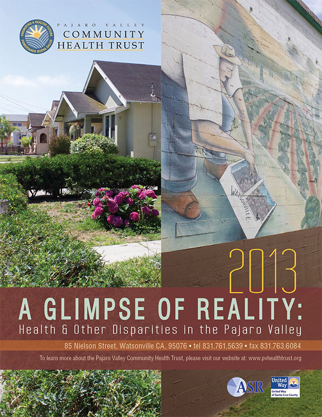 The Health Trust has engaged the services of Applied Survey Research (ASR) to conduct an oversample of Pajaro Valley residents through the Year-19 Community Assessment Project’s (CAP) survey of health and other quality of life indicators; our report, “A Glimpse of Reality: Health & Other Disparities in the Pajaro Valley, 2013” is the product of this effort. In this publication, we share and compare the responses of Pajaro Valley residents with those of Santa Cruz County residents.